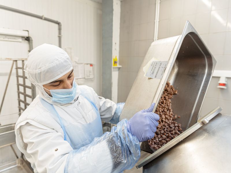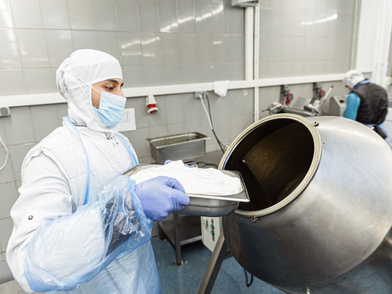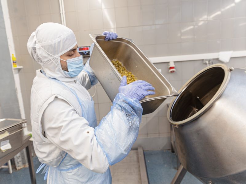 Приготовленный продукт перемещается на третий этаж по лифту, в цех последней обработки. На предприятии следят за тем, чтобы все процессы между собой состыковывались, а ингредиенты быстро смешивались: продукт не должен ждать в очереди.